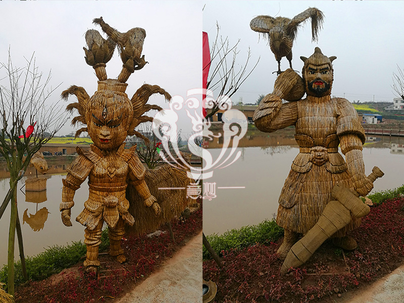 現(xiàn)在的精致稻草人藝術通常是由專業(yè)美術老師的造型放樣,然后由焊工師傅焊接出立體造型造型,然后以稻草或者稻草繩為材料編捆制作而成。