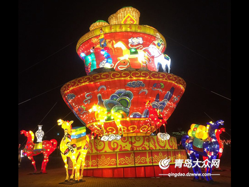 今年的賞燈節以“盛世中國夢,多彩絲路情”為主題,以張騫出使西域、鄭和下西洋等歷史事件為主線,用彩燈的藝術形式展現“絲綢之路經濟帶”、“二十一世紀海上絲綢之路”沿線各國的建筑藝術、商業藝術、人文藝術。 入口處的“好客山東”燈組結合景區原有主題綠雕,以曲阜杏壇為背景,傳達出“有朋自遠方來,不亦樂乎”的美好寓意,歡迎八方游客的到來。地池水面上極具中國風的超大型燈景“盛世中華”,以巨大的鏤空燈籠為主體,配以鮮艷的花朵和四條鯉魚,造型精致,具有極強的視覺沖擊力,讓人流連忘返。“歡樂影像”燈組利用投影儀和地面彩燈,讓游客可以參與互動,吸引了不少觀賞者,尤其受孩子們的歡迎。市民游客紛紛表示,今年的燈組新穎、好看又富有意義,特別值得一看。