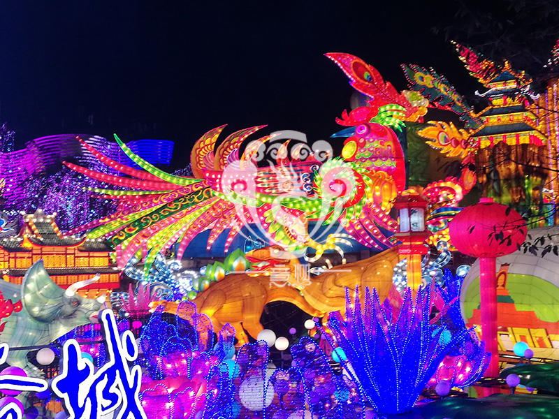 花鳥的題材,把花與鳥的形象巧妙的組織在同一盞燈中,在傳統花燈中廣為應用,如《鳳凰牡丹燈》、《孔雀牡丹燈》、《仙鶴長壽燈》、《鶴與桃燈》等。