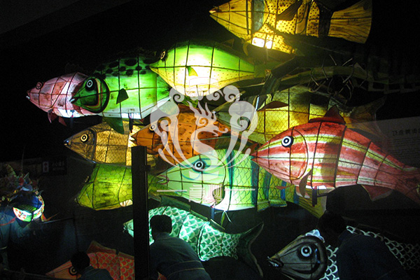 “魚“的題材,它的諧音“余”是和“富”的概念連系在一起的,反映了勞動人民追求幸福生活的愿望。有金魚燈、鯉魚燈等。還有一些水生小動物的題材,象蝦燈、螃蟹燈、青蛙燈……主要是表現生活情趣,或是宣傳科學知識。如《保護青蛙燈》,青蛙在荷葉從中覓食小蟲,形象生動地向人們宣傳了為什么要保護青蛙的道理。