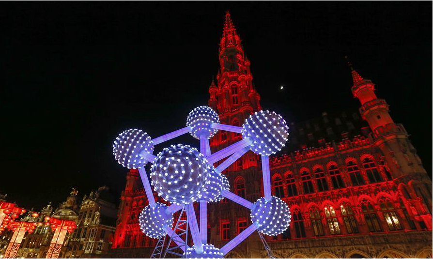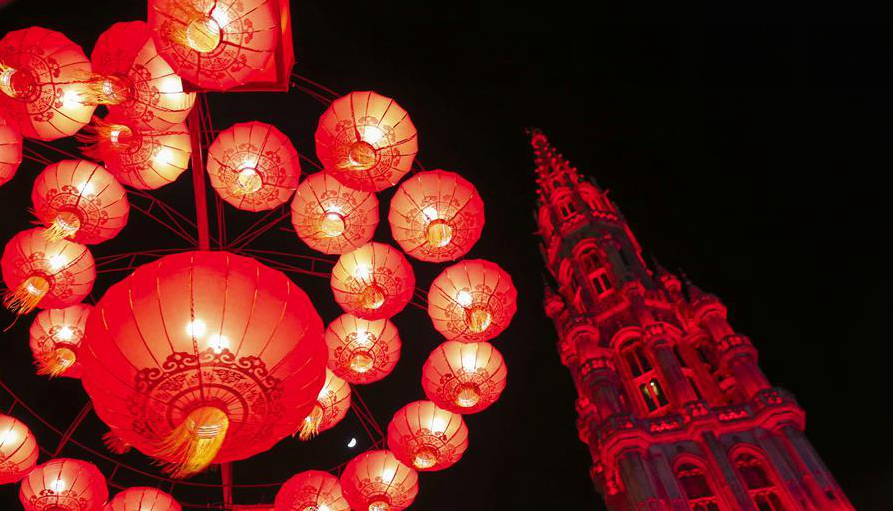 中國燈籠與亮起“中國紅”的布魯塞爾市政廳尖塔交相輝映